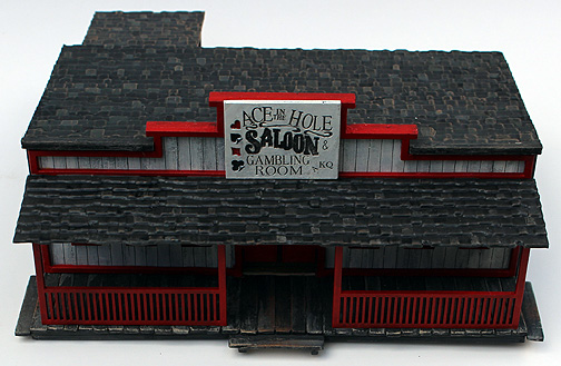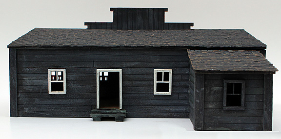 The awning and roofs are covered with O scale vac-u-formed shingles. The lower edge must be trimmed to shape and sanded to profile. It's fairly time-consuming.