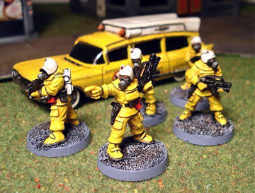 Finally the last remaining details were painted (sights, eyes, warning signs), and they were done. Since the troopers were primarily intended as a group of elite zombie hunters I wanted to give them some personalised transport (i.e., a car). I chosee a Corgi Cadillac Superior Ambulance model (from eBay). This is the kind of car the Ghostbusters converted to their "Ectomobile", and the Zombusters were born! I added two license plates to the model and filled the hole in the roof (where a flashing light used to be) but didn't alter it in any other way. I painted it to match my troopers: yellow with a white top. I also added some logos and lettering, and finished it off with a coat of gloss varnish. I'm very pleased with the look of the team. The sculpting of the troopers is awesome, and their tabletop presence is great as the yellow colour scheme really makes them stand out. Now all I need is some zombies to bust... |
