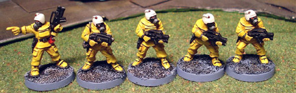 I chose to spend my first credit on (among other things) a squad of NBC Troopers. These are the first five. Although NBC suits are used in a lot of colours (including camouflage) in real life, I didn't want my little men to look too much like soldiers. I opted for yellow as the main colour, for a more striking protection/radiation suit look. The models arrived prepared, primed light grey, with all mould lines neatly filed off. I gave them a light spray coat of white for more vibrant colours, and painted them completely yellow.