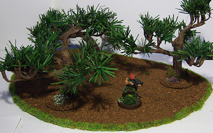 A while ago I stumbled upon some fake bonsai trees in a euro-store. I got ten of them for less than ten euros. They're made from real twigs with tape and fake leaves added to them. They were perfect for use as terrain. They just needed to be removed from their pots and based.