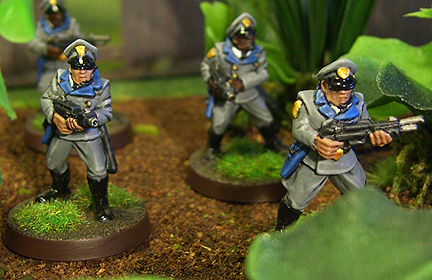 To get that lush jungle feeling going I got a good many varieties of plants. For each jungle base I picked two to three stocks of one or two larger plants to form the centre and glued these into place with the glue gun. Then I added some smaller plants to the sides of these. Finally the bases were painted with burnt umber, covered with dried tea and some small plants were added. |