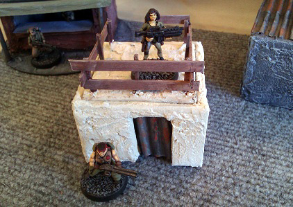 The open edges are covered with masking tape, and then the whole thing gets a coat of the filler/PVA mixture. On balance, the cardboard method produces thinner, more durable walls, although it takes longer. The fiddly process of taping off the edges can be a particular pain if your walls are a little ragged. After painting the walls, I printed some propaganda posters to give them a little more visual interest. I wanted to create a ragged shanty-town for my scavengers to inhabit, and the cardboard technique came to the rescue again. The wooden doors are made of coffee stirrers, while the corrugated metal sections are thin pieces of corrugated cardboard from the insides of pizza boxes. Window gratings were made from aluminium car body mesh, which costs less than £2 a sheet at my local hardware shop. I'm still on my first sheet. Plankings and railings were made from coffee stirrers and craft sticks.