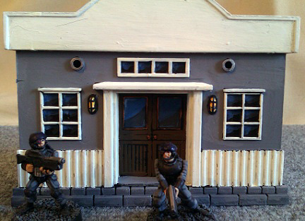 Combat Zone practically demands an urban (or at least semi-urban) play area. This means lots of great tactical opportunities, with tricky lines of sight, varying heights and plenty of cover. This is all great for the gamer, but it can seem a little tough from a modelling perspective. A green sheet and a few trees isn't going to cut it for this project. Because I'm on a budget, I resolved to make as much of my city out of junk and things from the pound store as I possibly could. The first thing to do was to gather materials. Almost anything can be used to make scenery, but the things you really want are polystyrene foam, cardboard, light wood, plastic card, and wire. I was fortunate enough to work in an office that discarded huge quantities of polystyrene every day, so I scavenged up enough of it to last me a lifetime with just a few trips. Cardboard came from the usual places – cereal packets, boxes, the backs of notebooks and so on. The very thin corrugated card you get in some pizza boxes is particularly useful. I also saved bits of plastic packaging that had interesting shapes, grabbed handfuls of coffee stirrers from restaurants and coffee shops, and kept a keen eye on freecycle. If you're not paying attention to Freecycle, you're missing a trick. Freecycle is a network of internet mailing lists where people give things away free to those who can collect them. I scored a large quantity of MDF, dozens of partly-used “tester” paint pots, and even a big box of miniatures and terrain (although that's another story). The secret weapon in my terrain-building arsenal was simple ready-mixed filler. I bought two tubs of this from a pound shop and have used them on nearly everything to cover up the distinctive appearance of cardboard and polystyrene. For maximum coverage, I find that mixing the filler liberally with PVA glue until it becomes a smooth, sticky paste is best. I apply it with a piece of scrap cardboard or a craft stick, then sand it down once it's dry. The dust from sanding does get everywhere, so I'm always careful to lay down some newspaper before working with it. I've chosen a set of buildings for this article that demonstrate a variety of different approaches.
