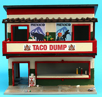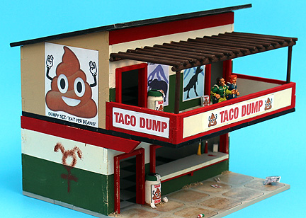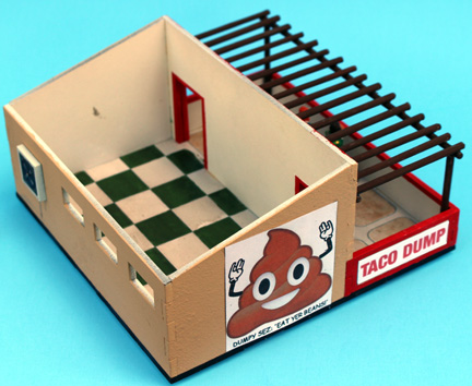 I added a trash cans on both levels, and scattered trash of various types. I printed out wrappers and bags with Taco Dump logos on them, and painted rolled-up paper as discarded cups.