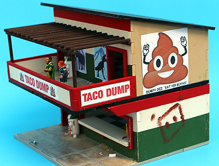 Taco Dump. The second most popular eatery in the Combat Zone. Their cheerful mascot, 'Dumpy,' always smiles down on you,