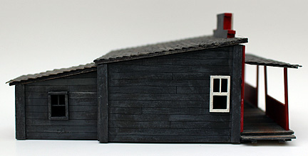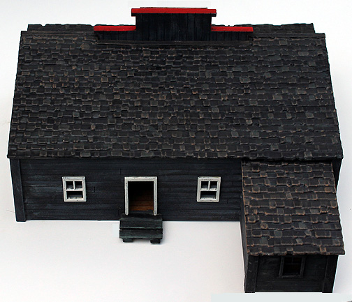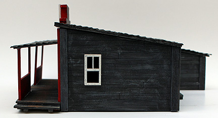 The awning and roofs are covered with O scale vac-u-formed shingles. The lower edge must be trimmed to shape and sanded to profile. It's fairly time-consuming.