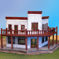 This imposing edifice is Arnica Montana's model 201-K Five-Sided Saloon. Mine dates from before Hawgleg was producing them, so may differ in detail from theirs. It's a resin kit, consisting of 16 well-cast parts, and is not recommeneded as a first-time kit. They suggest building one of their simpler kits first.