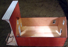 I opened the doors and windows using the etched locating lines on the walls as guides. The MDF is easy enough to cut, using a sharp x-acto blade. The frames cover any slight irregularities. The interior floor was made from craft sticks, and adds rigidity to the building.
