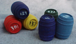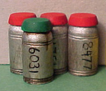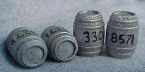 These are made from a 3/4" turned wooden barrel. They can serve easily as metal casks (above) or plastic kegs (below.) Mind you, the brightly painted barrels could be painted metal. You could always paint them as normal wooden barrels!