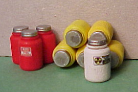 I painted them in various colours and added warning labels printed on my computer. They are rather fiddly, so I glued them together in 3's: That way they will stand or stack and they don't roll about. I did leave a number as singles.