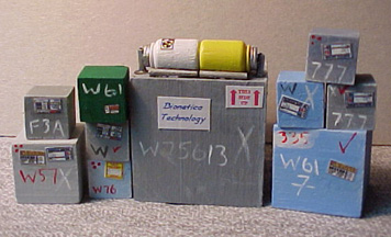 Also known as boxes. Simple wooden blocks of various sizes, painted as metal or plastic containers, with various labels added, and the chalk & felt pen markings added on loading docks everywhere. The crates range from 1/2" to 1", the largest being suitable for equipment or (in this case) an bio-container.