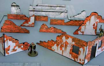 thick mounting board is ideal. Cut out pieces of board about 5mm bigger all round than the scenery piece which is to be mounted on it. Glue the piece to the card using PVA or craft glue then leave them for about 24 hours under something heavy like an old telephone directory, a wargamer’s lunch or a passing mastodon. Remember that you will have two of each piece (once from each sheet) and that they are printed differently on each side. One side has graffiti on some pieces, the other doesn’t so glue the mounting card to the graffiti side of one sheet and the non-graffiti side of the other. This way, although each piece will have a duplicate shape, they will all be different. Once the glue has set the pieces need to have the excess card trimmed from round their edges. Also door and window openings need to be cut out. There is nothing better than a scalpel blade, in a proper scalpel, for this kind of job. However, scalpels are capable of inflicting serious wounds (that’s what they’re for, after all). So if you have any doubt, use a modelling knife. Juniors shouldn’t use sharp blades without adult supervision and adults should be very careful, obeying sensible safety rules such as always cutting AWAY from their bodies and keep fingers out of the line of cutting. For straight cuts, guide the blade with a steel ruler. If you take a look at the low wall sections, you’ll see there are some “damaged” parts. You can either cut the mounting card away so that the gaps are as printed or leave the card in place so that a rough repair can be modelled (as described later!).. Once the pieces have been trimmed, they need to have a base added to keep them upright! All |