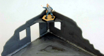 The largest piece of scenery, the one with 2 windows and a door, makes a good permanent corner item. After the piece has been glued to the mounting board, cut it in two about 25 mm from the door opening. Cut out a triangular piece of card for the base; this should be about 155mm x 130mm x 200mm. The wall pieces are glued to the 155 and 130mm edges. The resulting piece is a very solid item. It can also have a small platform glued to the upper level of its corner to provide a raised firing platform (see photo above).. To reinforce the join between walls and base I added a strip of Milliput modelling putty (see photo). As well as providing extra strength it also gives stability by virtue of its added weight. On the small lengths of wall (less than 60mm long) I covered the whole base in a layer of Milliput to give even more stability.. To finish off, it is necessary to paint the bare card side of the walls. Now that they have printing on one side only, the inside needs to be represented as some form of rendering. A plain light grey makes a good finish ( I painted the pieces in the photos a dark grey so that they would show up better against the light grey playing surface but I’ll probably repaint them light grey now the photos are taken). If you want a rougher finish, simply mix some fine sand into the paint to give a breeze/cinder block look..
