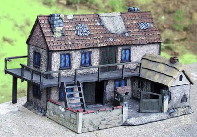 em-4's new Fantasy/Medieval Inn comes fully painted and assembled; ready to use out of the box. A fantastic centrepiece for wargames or role-playing games, useable as a country inn, or a rustic farmstead. There are two sets of opening doors (the entrance to the yard and rear main entrance to the main building). Removable roofs on main building and stable enable interior placement of figures. 28mm scale. Dimensions - 19cm x 26.5cmm (including courtyard and overhang of balcony). Height 15.5cm to pitch of roof. Price (incl VAT): £39.00