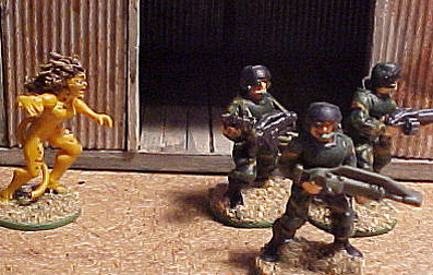 Silver Weapons: Silver bullets: Silver has very poor ballistic properties. Therefore any weapon loaded with silver bullets halves all range characteristics with the exception of point. A silver bullet fired at an ordinary target gets a -1 to the wound dice to simulate silver's poor ballistic properties. Such a bullet hitting a werewolf will do double damage. E.g. a heavy pistol shot hits a werewolf. The shot does 2D8 of damage. In this case the shot rolls a 12. As it’s a silver bullet the damage is doubled, so it does 24 points of damage. When using silver bullets the player must state so, and which weapons they are loaded into before the game. Silver bullets cost no extra points. Silver Dagger/silver stake: Silver is very soft and difficult to put an edge on and because of these factors it is a one use weapon. In ordinary hand to hand it is pretty useless, however against werewolves these weapons give the exterminators a last chance. In ordinary hand to hand a -1 modifier is added to all wound rolls. Against werewolves the wound roll is as normal, however like silver bullets it is doubled. Silver daggers/stakes have a points cost of 1. Gaming Ideas/scenarios: Dogsoldiers: A military patrol has been caught out in the combat zones. The werewolves are closing. They make it to a building and barricade themselves in. Can they make it to dawn? This can be a typical CZ game with lots of urban terrain. However if you fancy a change, you could try the game like the movie with the troopers caught out in a remote forest. The Dogcatchers: A hunter squad has been sent out to capture a lone werewolf. Can they achieve their mission objective? My name is Van Helsing: Darkness falls, the howling begins. Gangs tremble in their hideouts. Corporate troopers flick off the safety catches on their weapons. Into the arena strides an Exterminator, ready to do battle with the forces of evil. The Running Man: Captain John Pendle has been caught by werewolves. As there isn’t much game around on this night, they decide to opt for some sport. They strip Captain Pendle of his weapons. The pack leader then informs our hero that if he can make it past a certain point he will live. If they catch him, he is dinner. The good Captain is under no illusion that the werewolves will keep their side of the bargain, but it’s the only chance he has. The captain agrees, with a few flip comments to annoy the werewolves (in this case trying to fit “walkies” and “bath” into the conversation as often as possible!).