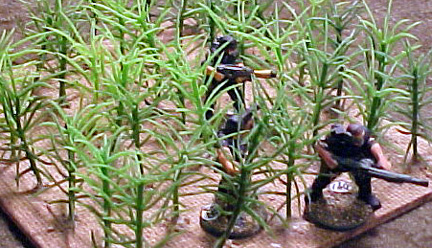 Not all battles take place in the inner city: Even there, any vacant lot can harbour weeds or crops. And they can hide your enemies. There are two great sources for basic greenery: Craft stores and Aquarium supply shops. Craft stores will often have stems of artificial greenery with dozens of useable 'bits' , and aquarium shops will have 'sheets' of vegetation. Corn Fields