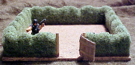 These hedges are made from artfully-trimmed dollar store pot scrubbers. The opening gate is made as per Gate 2 in How to Hang a Door. All my fields are small, as they are untended to be hidden amongst vacant lots, but you can make them as large as you want. I haven't come close to using all the plants, shrubs & bushes I got on single stalks. A couple of stalks would fill a large area. Look closely at the plant types at the shops. There are desert plants, farm crops, decorative bushes and vines, and they are all inexpensive Best of all, they make your table look good. |