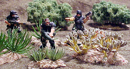 These bushes are solid blocks of sponge dyed green, with bits torn off. The bases are plastic with wire stalks attached to 'em. Once the base is painted and coated with sand, the bushes are pushed onto the glue-covered stems.