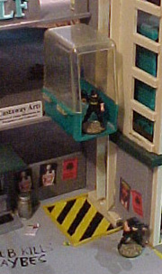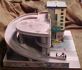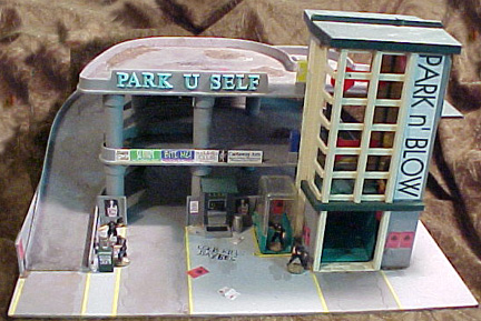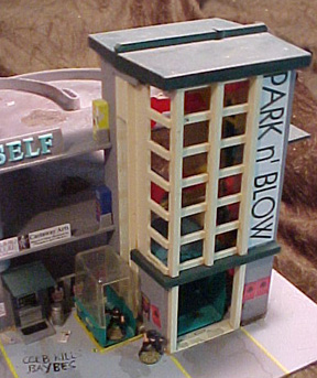 The Park U Self had been a landmark for years, even though the name bordered on being a rude joke. When FrostyCorp took over, they decided to change it to something less suggestive. Thus was born the 'Park n' Blow.' It towers over the surrounding area and has always been always a popular hang-out for local gangers. Rain or shine they had two levels for partying, and the top level gave them the height to spot any threats coming their way. FrostyCorp set out to change all this. If there was going to be rowdy parties amd loads of illegals, they wanted a cut. They installed very effective security, and managed to get the gangs to negotiate. It didn't hurt that they could close the local 'Barf' if the gangs didn't play ball. The building started life as a Fisher-Price parking garage: When it was first released it had a fibreboard base and an enclosed elvator. Later versions have a thick plastic base and an open elevator with holes for the FP peg-people. Look for the early version.