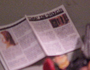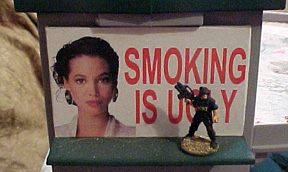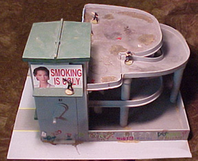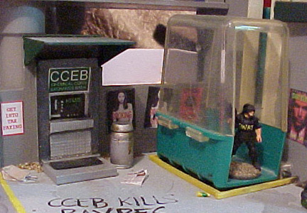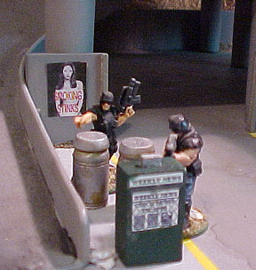 There is another that causes the floor to tip up and dump the car out on the top level. I disabled this feature. The posters are printed on my computer: Ads for the band 'Kittens', 'Tax Paying is Cool', 'Johnny Mnemonic', and Christy Turlington anti-smoking posters I masked & painted a warning area under the elevator, and bordered it with match sticks. There is a bag of something and a discarded copy of the Combat Zone Chronicles on the ground by the ATM machine. There's a Weekly World News up top.