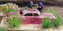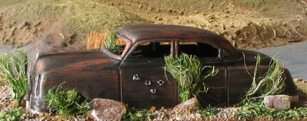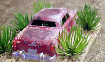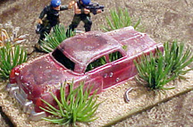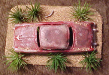 Since I wanted the shell sidding on the ground I removed the wheel holders. I first sprayed the car red. It was already red. When it was dry, I masked and sprayed the grille and bumpers. Details were picked out with silver paint. Actually. with a decent paint job, they don't look so bad. I painted the centre area black, and glued the 3 bushes that are inside the car into place. I then affixed the car to the base. I 'distressed' the upper surfaces of the car with gunmetal, silver, rust, and dark brown, and added 'watermarks' where liquid had pooled. |