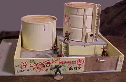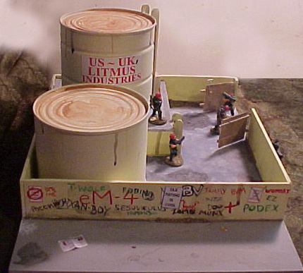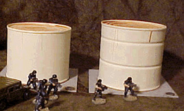 As the site says: With very little effort, you can make terrain that looks like you didn't put much effort into it. I was never really pleased with the results, so I decided to finish the work I'd been putting into them I had already added a sign, a ladder, and other detail to one tank, but they needed more. I built a split-level enclosure and base out of cintra, and primed it. I then glued the cans into place.