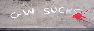 A bit of editorializing on the sidewalk out front. Judging by the blood smears, the fangboys won this one.
