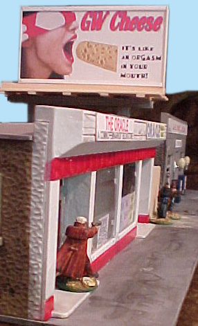 This particular building had originally been the hardware/drugstore, but had been thickly & garishly painted, with pictures and signs glued on. to make a saloon. On the down side, the back wall was glued on upside down, with the doors against the roof.