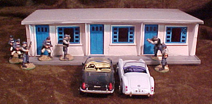 The Motel is laid out as you see here. It takes up a fair amount of space on the table, but gives you an area with clear fields of fire.