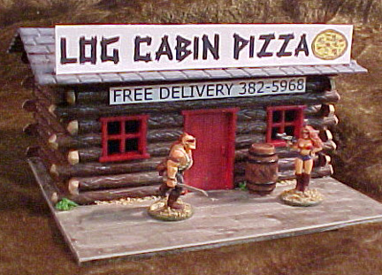 Then, as I was driving through the city, I noticed something odd in a parking lot. A crude, plastic-looking imitation log cabin, with the wonderful sign, 'LOG CABIN PIZZA'.