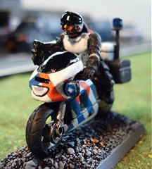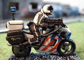 Using a lot of reference pictures, the bike was painted white with orange/blue stripes. Black parts were black with a dark grey drybrush. Metal parts were painted metal, some with a silver highlight. The rider received a different uniform than hisfoot colleaguest. He was given a complete drybrush with a dark brownish grey (this makes the black look a bit more natural than a blueish grey). I added reflective stripes (metal mixed with white paint) to his arms and legs. His body armour and helmet were painted white, with an orange strip across his back. Because the model had much more black elements than my foot models, I drybrushed the gun with metal to add more distinction, and the gun strap dark grey. I glued the riders to the bikes and gave them a coat of matte varnish. I picked out the windshield, visor, all metal parts, all lights and sights, the belt and the gun in gloss varnish, and they were ready to roll!