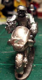 Now attach the upper body to the legs so the arms reach the handles, and attach the handles as well. Give the model a right arm of your choice (I went for the metal SMG arms from the command set), and glue in place. Also, attach the head as you like (leaving it on will have the model looking down too much, which is why you had to cut it off). The last step to be done is filling all the gaps (and there's quite a few) with putty, Leave to dry and your trooper has become a motorcyclist ready for painting! Though the bike comes with an integral base I glued it to a 25x50mm base, smoothing the transition with putty I also removed the protrusion from the front (which I assume to be a gun barrel), and filled the gap with putty.