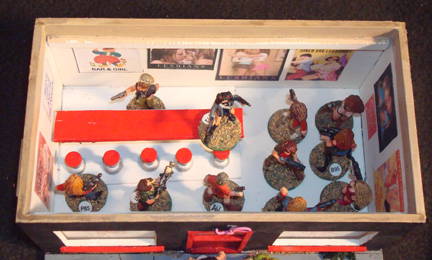 The bar and seating inside is a removable unit, made from scrap sintra. The seats are push pins. Supports for the roof are glued to the front & rear walls.