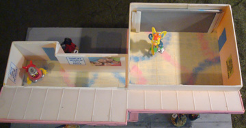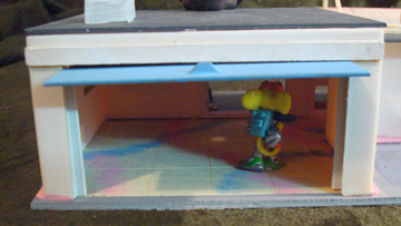 You too can have a designer child without paying those high laboratory prices. Just go to an outlet store! At a recent garage sale, I bought a bag of car-type toys for a dollar... because it contained a useful-looking building! It was a single-piece styrene casting, bright yellow, with clear plastic windows and door, originally intended to represent a service station or car dealership. The first thing that had to go was a healthy covering of stickers: Repeated applications of lighter fluid removed them without harming the plastic. The roof was cut away by scribing on the inside where the walls met the roof, with the back edge of an Xacto knife. Eventually I was able to just pop it off, but it took some work. (The roof plastic was thicker than the walls) There were a number of vents moulded on the parts removed, and I cut them away for use on other buildings. I tried to remove the windows, but they weren't going to come out without real damage to them and to the building. I also removed the door and put it somewhere 'safe.' Safe from me in any case, I haven't seen it since. New roof sections were cut from sheet plastic, and locating lugs added to keep them in place.