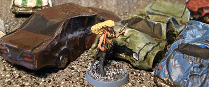 Pour the plaster into the mould (you can mix some wood glue into the plaster to give it more strength), taking care that the underside of the car is level and that the mould is filled to the brim, otherwise you'll have half a wreck (though you could still use these as half-buried wrecks). Wait about half an hour for it the plaster to harden, then take off the foil and with a crude hard object like a screwdriver or sturdy knife scrape away any unnecessary blobs of plaster from the car. You'll have some excess plaster especially at the bottom and if the wheels didn't form completely you can scrape these into holes as well. When you are done leave the wrecks to dry thoroughly until they're ready to be painted! Plaster requires some preparation before painting since plaster is very porous. I give mine a coat of wood glue before spraying them black. Since I wanted many wrecks I kept the paintjob simple: a basic colour, a drybrush with a much lighter colour to bring out the crumples, details like bumpers and door handles in metal or black, a wash of brown paint and finally I paint the tyres (if any), windows and outlines of doors and hoods black. I've tried drybrushing them with metal paints but it didn't look very convincing. Being made of plaster they remain fragile and dropping them will usually mean you have quite some repainting to do, so they will need to be handled with care. I made thirteen in total and though I've been tempted to glue them into stacks I kept them loose so they can be used as a more versatile piece of terrain suitable for building settlement walls, barricades and mazes. |